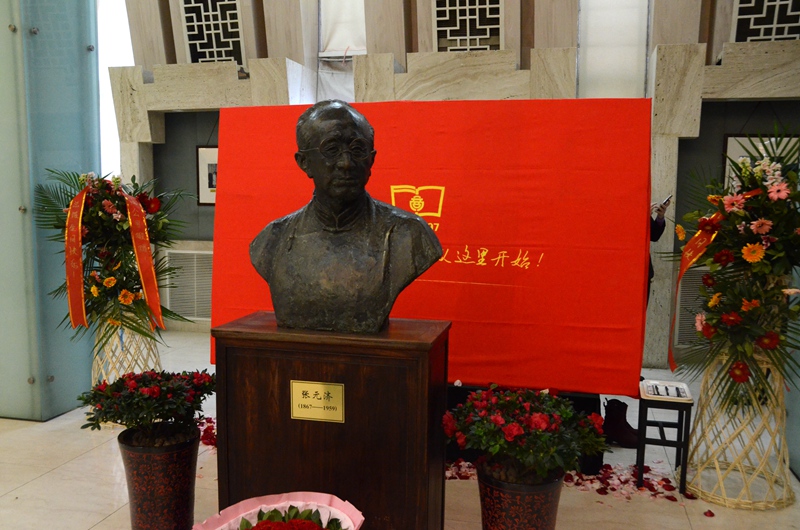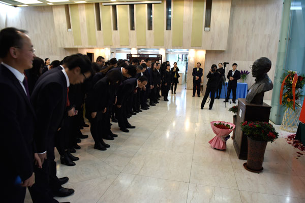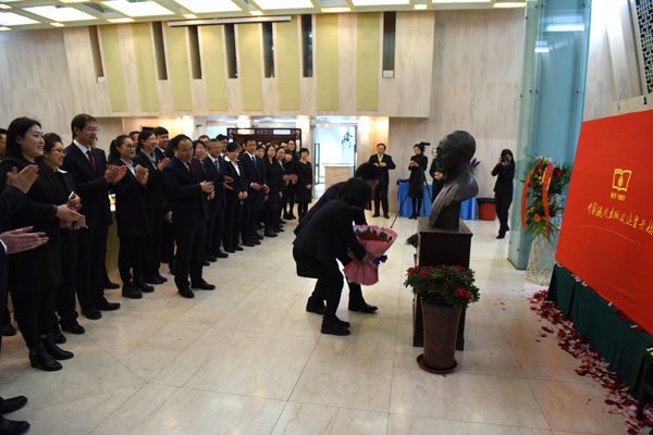 國(guó)際公司全體員工為總館120歲生日準(zhǔn)備了美麗的花束,并將其敬獻(xiàn)至商務(wù)印書(shū)館先驅(qū)張?jiān)獫?jì)先生,并向張老三鞠躬以表敬意。